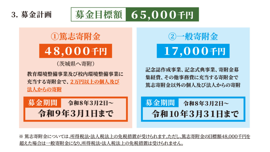 募金趣意書では一般寄附金の募金期間が令和10年3月1日までとなっておりますが、一般寄附金は令和10年3月31日までです。申し訳ありませんでした。